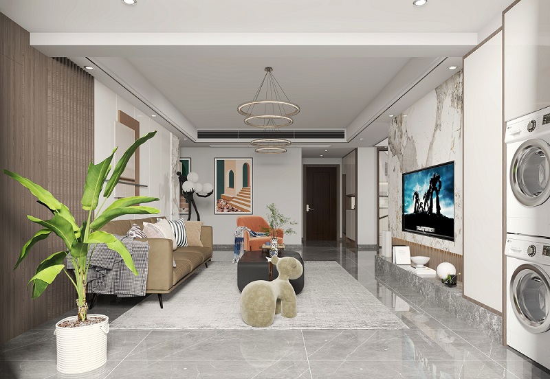 客廳選用飽和度較低的色彩搭配,將輕奢風(fēng)的低調(diào)詮釋地淋漓盡致。一抹亮色的碰撞,增加了空間的層次。地面統(tǒng)一鋪設(shè)淺灰色地磚,搭配同色系的地毯與極簡(jiǎn)的茶幾,顯得整個(gè)空間舒適且富有格調(diào)。