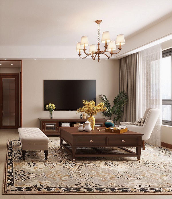 空間的整體布局散發(fā)著古樸的味道。復(fù)古的地毯、線條流暢的原木茶幾以及典雅的沙發(fā),讓客廳變得端莊且富有詩(shī)意。