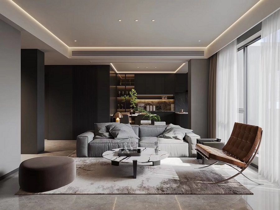 沙發(fā)、茶幾、地毯等均選擇簡潔的線條。大面積的木質(zhì)和布藝相碰撞,點綴零星金屬元素,使整體環(huán)境看似低調(diào)寧靜,實則暗藏鋒芒,抓人眼球。