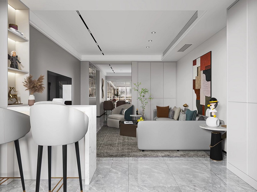 簡約舒適的空間下,以淺灰色布藝沙發(fā),搭配深灰色地毯與質(zhì)感的多邊形茶幾,角落的大綠植點(diǎn)綴,為空間增添一抹色彩。