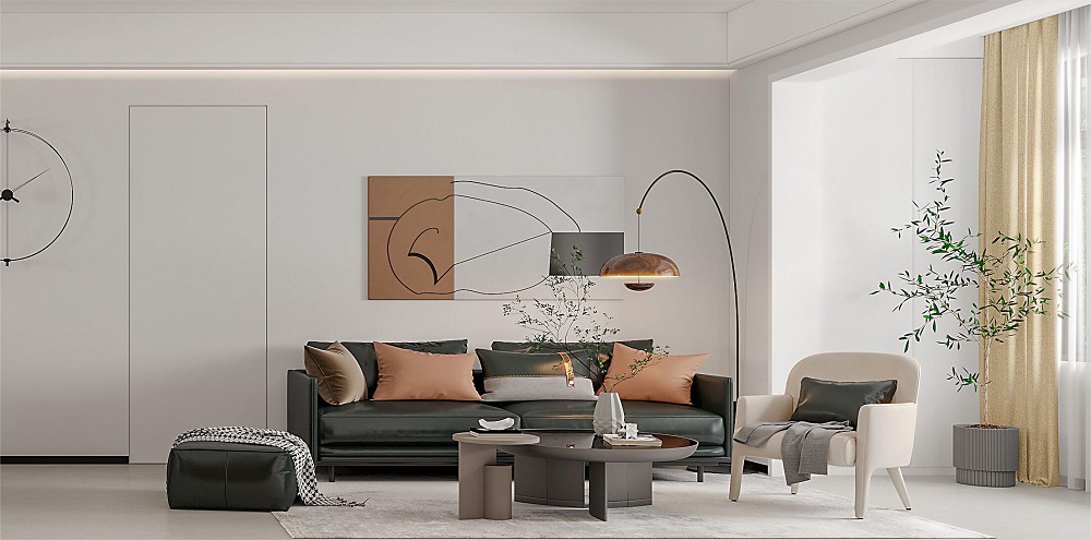 客廳區(qū)域精準(zhǔn)拿捏線條、色塊比例。幾何形的燈具和茶幾消解了大面積色塊沉重感,展現(xiàn)出更為細(xì)膩的質(zhì)感。